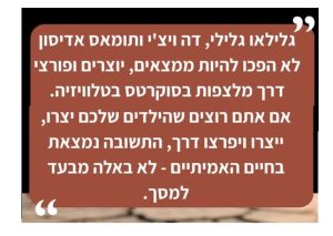 גלילאו גלילי, דה ויצ'י ותומאס אדיסון לא הפכו להיות ממצאים, יוצרים ופורצי דרך מלצפות בסוקרטס בטלוויזיה. אם אתם רוצים שהילדים שלכם יצרו, ייצרו ויפרצו דרך, התשובה נמצאת בחיים האמיתיים – לא באלה מבעד למסך.